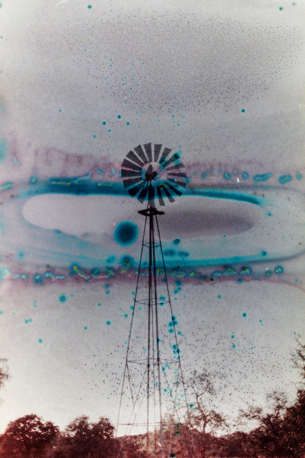 35mm film image, digital scan. Windmill on family ranch in Goliad, Texas. Shot with Canon AE-1 on Fujifilm and soaked in grapefruit juice.